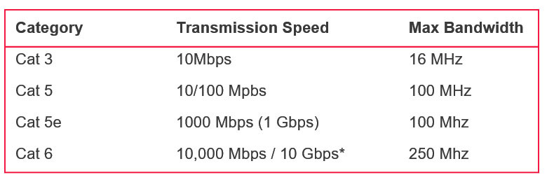 به احتمال زیاد روی کابل شبکه کلمه “Cat” را دیده اید که عددی در کنار آن قرار دارد و با آن توصیف می شود. این ترکیب به دسته اترنت اشاره دارد که آن کابل خاص در آن دسته قرار می گیرد. کابلهای اترنت در دستههای مختلفی قرار میگیرند، که در بردارنده اطلاعاتی در مورد نحوه ساخت کابل، میزان دادهای که میتواند انتقال دهد و با چه سرعتهایی میتواند دادهها را حمل کند، است. جدول زیر را بررسی کنید تا هر دسته از کابلهای شبکه چه کاری انجام دهند.