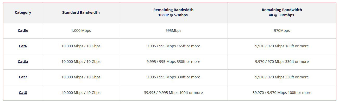 با نگاهی به جدول می توانیم پهنای باند باقیمانده در دوربین مداربسته با رزولوشن 1080p با پهنای باند 5 مگابیت بر ثانیه و دوربین 4K با پهنای باند 30 مگابیت بر ثانیه، را ببینیم. بسته به کاربرد مورد نظر، کابل شبکه را برای دوربین مداربسته انتخاب کنید. برای خانه ها و مشاغل، بهترین کابل Cat5e است، زیرا شما نیازی به انتقال بیش از 1000 مگابیت در ثانیه ندارید، حتی در وضوح 4K. با این حال، با زیرساختهای شبکه گستردهتر، بهتر است از یک سیستمعامل Cat6 بالاتر استفاده کنید، زیرا میتواند چندین گیگابایت داده در ثانیه انتقال دهد.